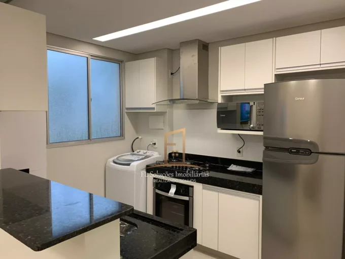 2 quartos sendo 1 suíte com armário, Sala, Cozinha com armário, Banheiro Social, Área de serviço, Elevador, Garagem.