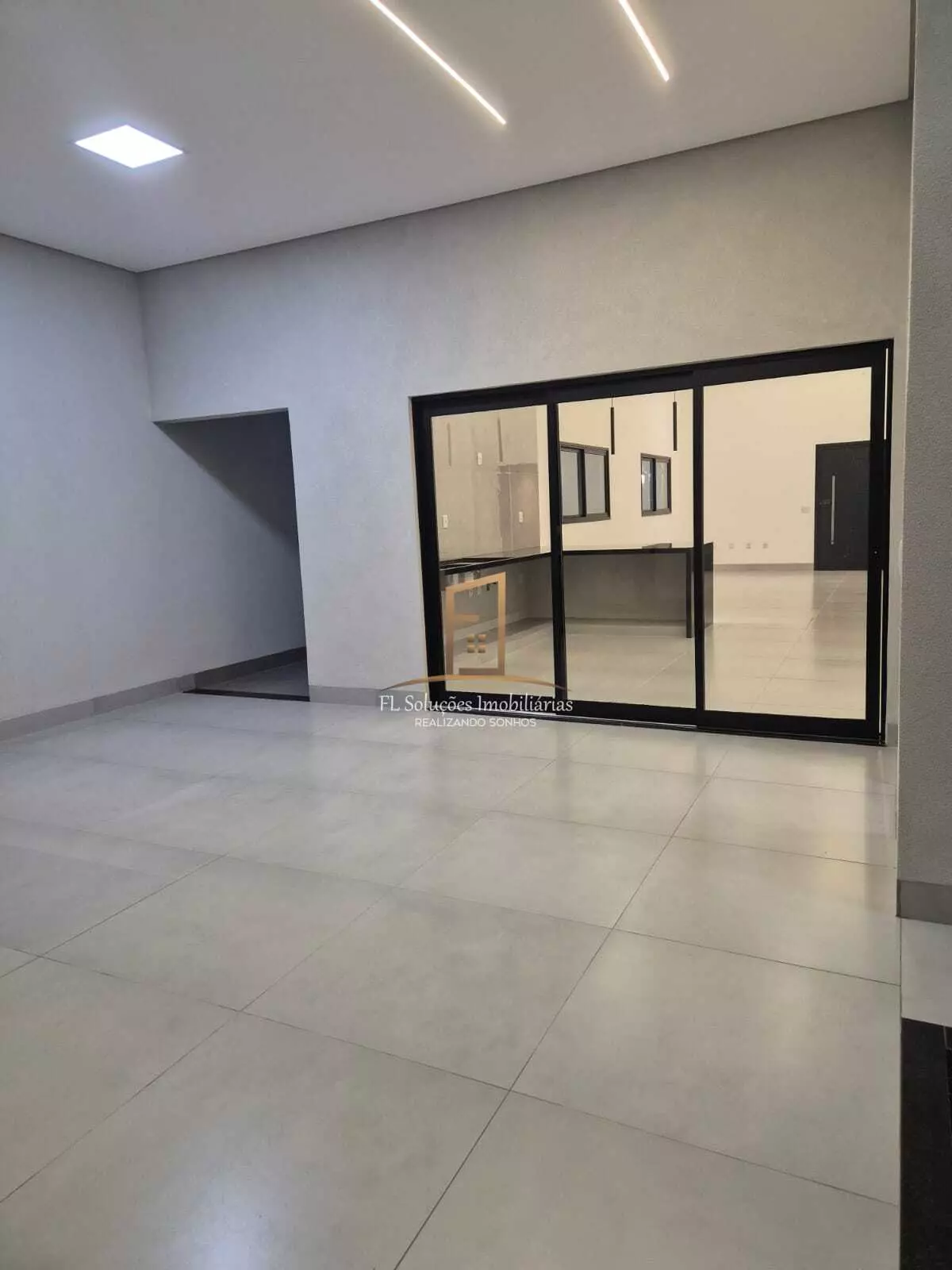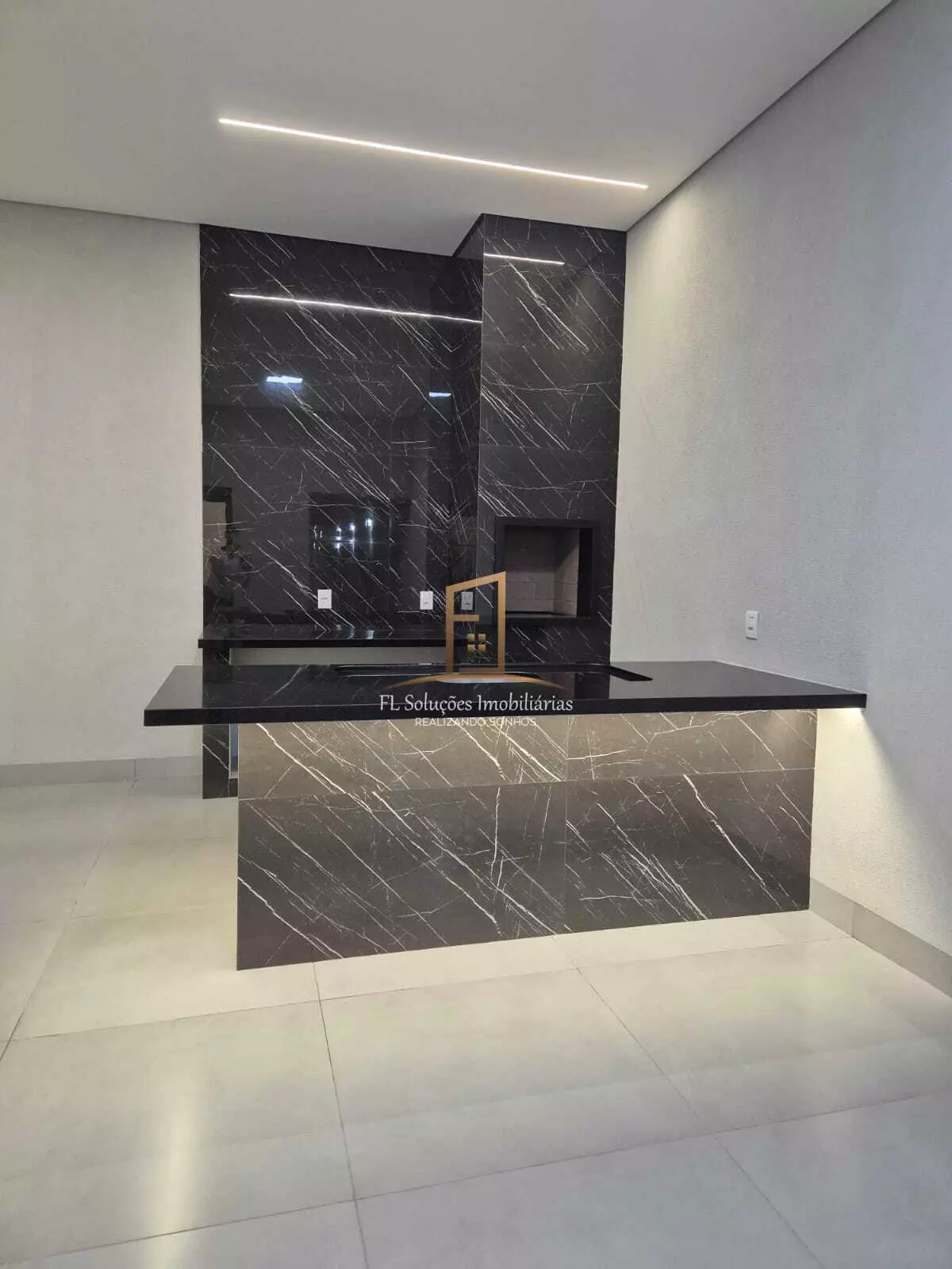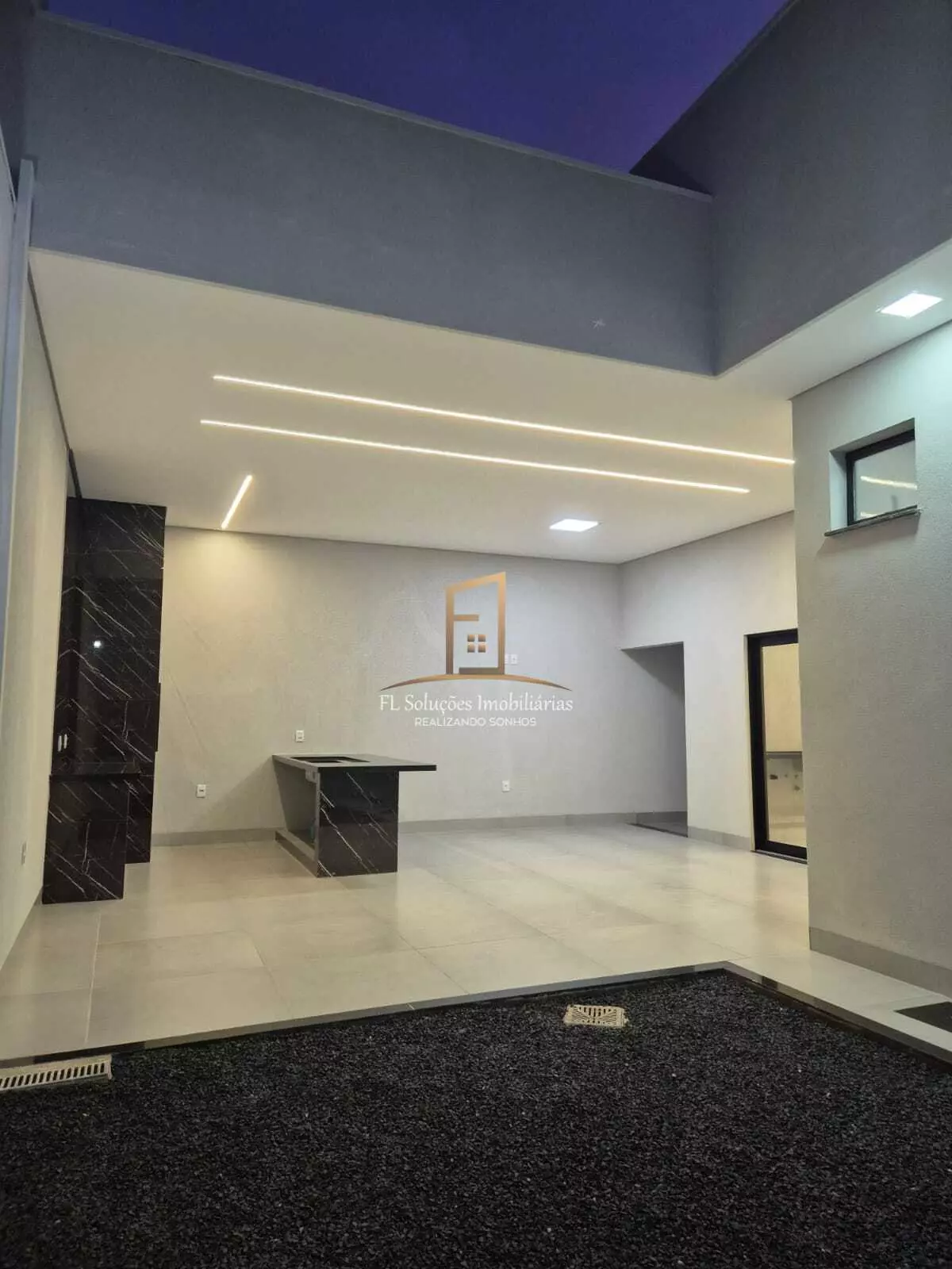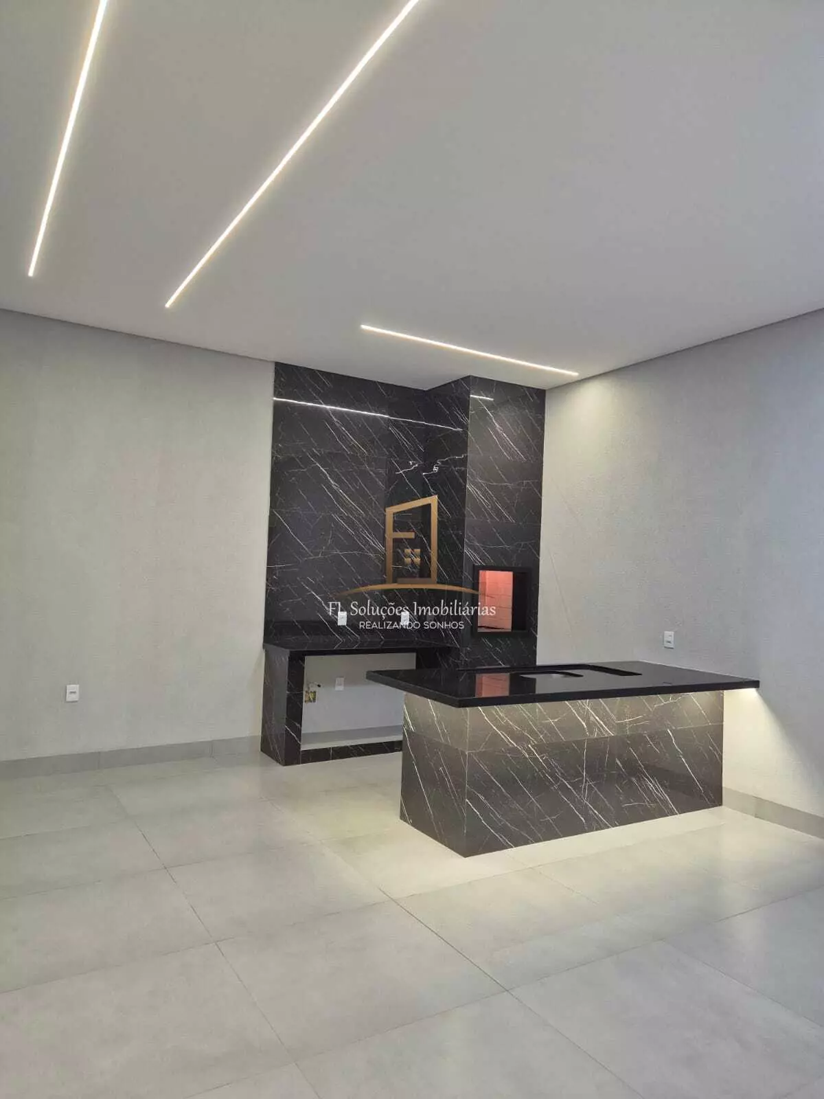 3 quartos, sendo 2 suítes (uma com jardim de inverno e closet), Sala com dois ambientes e pé-direito duplo, Cozinha americana, Banheiro Social, Varanda Gourmet com churrasqueira e bancadas, Lavabo, área de serviço, Garagem coberta para até 3 carros e espaço no fundo.