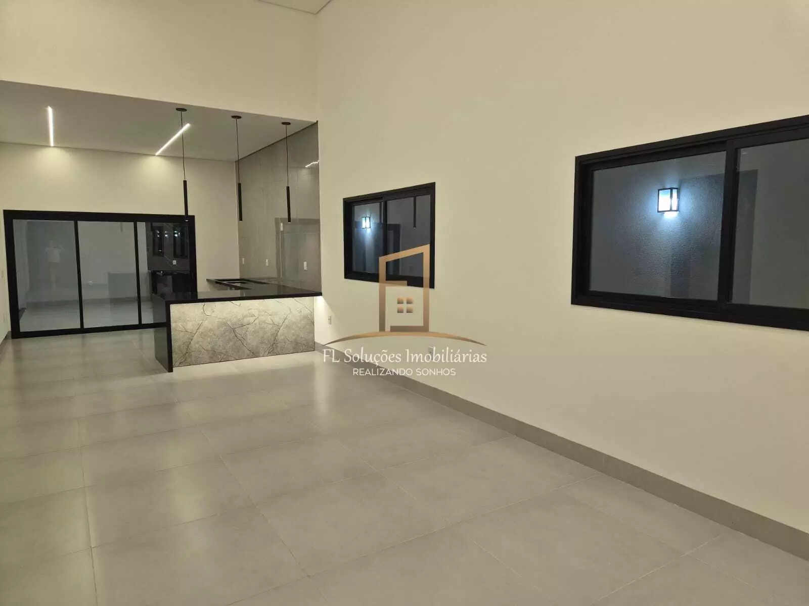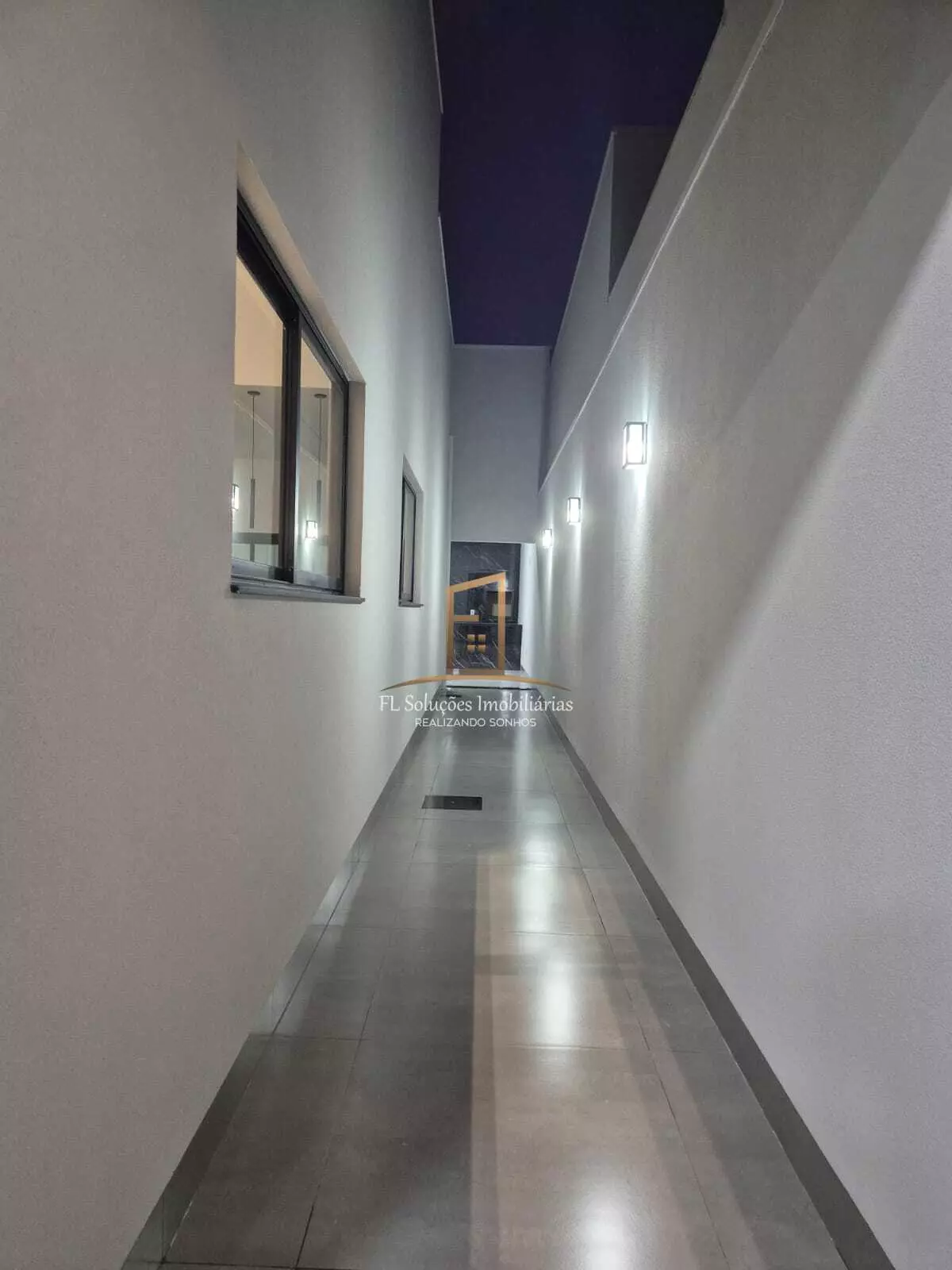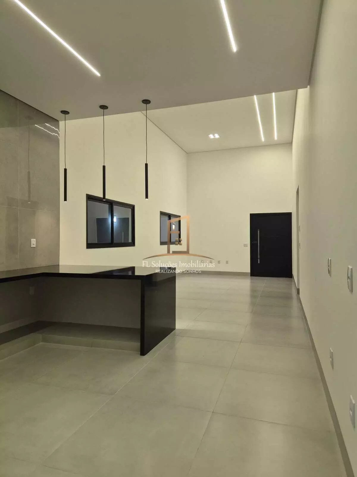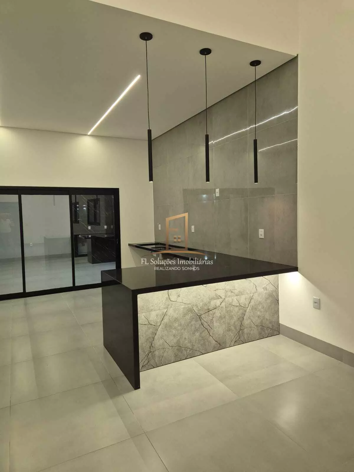 3 quartos, sendo 2 suítes (uma com jardim de inverno e closet), Sala com dois ambientes e pé-direito duplo, Cozinha americana, Banheiro Social, Varanda Gourmet com churrasqueira e bancadas, Lavabo, área de serviço, Garagem coberta para até 3 carros e espaço no fundo.