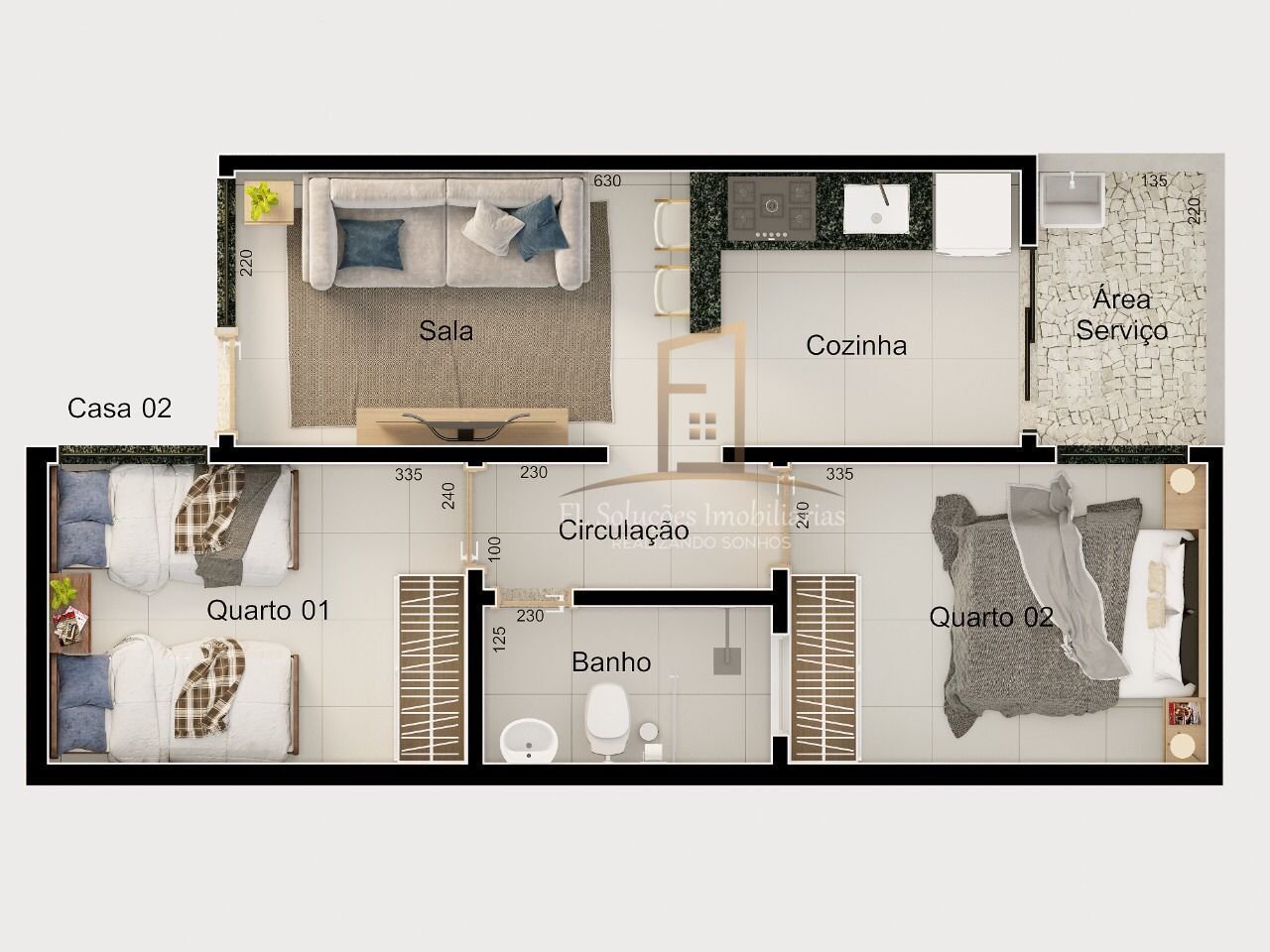 2 quartos, Sala, Cozinha americana, Banheiro Social (chuveiro com tubulação de energia solar), Área de serviço, Garagem, Portão independente, Corredor privativo para cães e crianças.