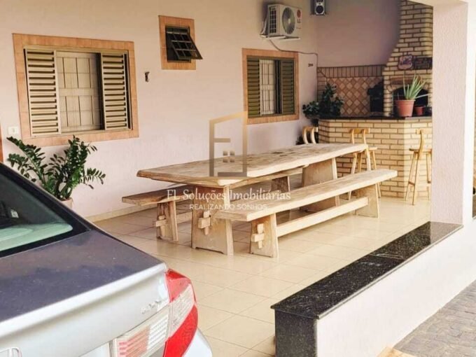 3 quartos, Sala, Cozinha, Banheiro Social, Lavanderia coberta, Churrasqueira, Quintal gramado, Corredores na lateral, Varanda, Garagem.
